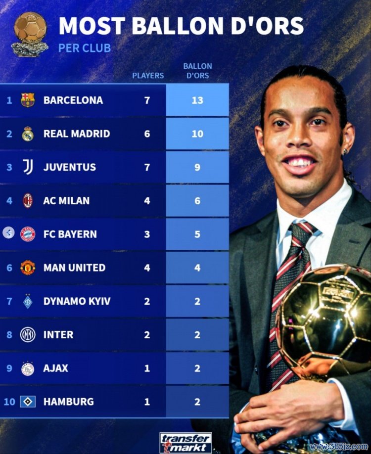 俱乐部球员夺金球次数排名:巴萨7人13次居首,皇马6人10次第2