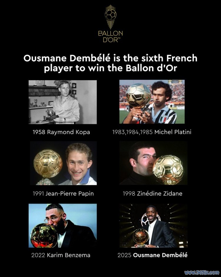 9月23日讯 登贝莱获得2025年金球奖,金球奖官方晒图, 马德里竞技英超直播这名巴黎前场球员成为历史上第六位获得这项荣誉的法国球员。