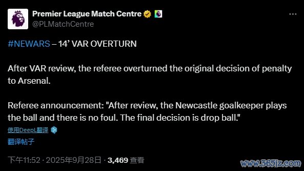 09月28日讯 阿森纳vs纽卡第14分钟,约克雷斯单刀赴会机会,危险区域 内倒地,裁判 先吹罚十二码球,观看运动视界随后查看VAR后确认守门员先碰球无十二码球。