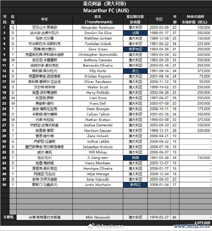 25-26赛季亚冠二级职业联赛 (小组赛阶段)澳大利亚麦克阿瑟球员名单