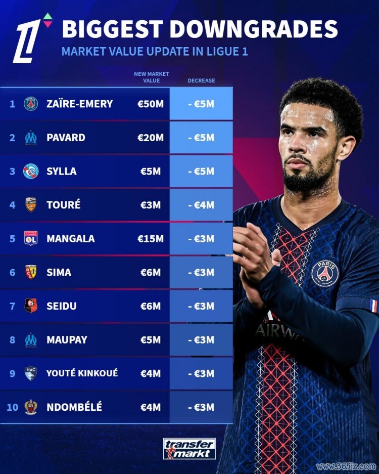 法甲球员身价下跌榜:扎伊尔-埃梅里、帕瓦尔、希拉-500万欧居首