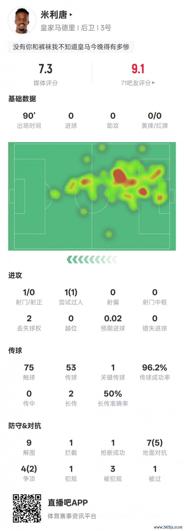 米利唐本场数据:1关键传送球 9解围+传送球 成功率96.2%,评分7.3