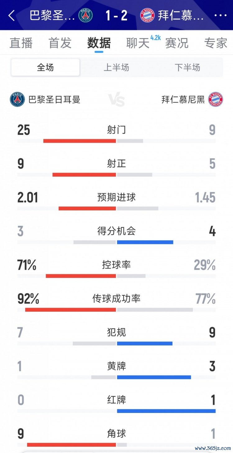 拜仁2-1巴黎全场数据:射球 9-25,射正5-9,积分 机会4-3
