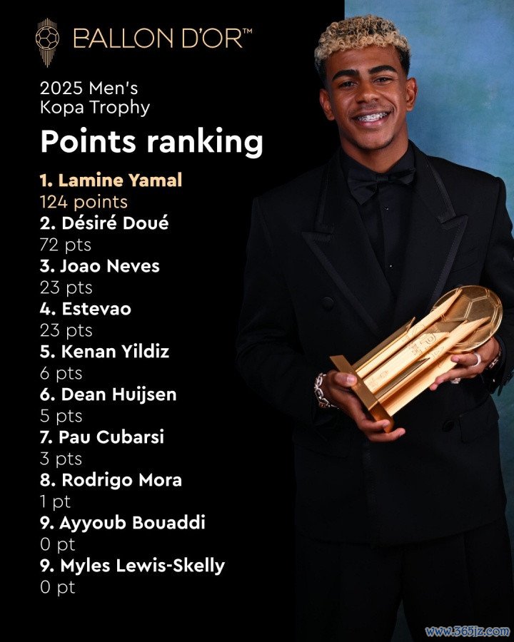 直播吧09月27日讯金球奖官方今天公布了男子科帕奖的得分细节,其中亚马尔124分成功卫冕,以52分的优势领先于获得72分的杜埃。阿森纳小将斯凯利和里尔小将布阿迪未能在评选中获得分数。