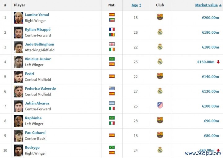 西甲最新身价前十:亚姆贝前三维尼修斯仍第四,佩德里1.4亿第五