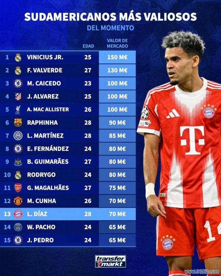 10月18日讯 德国转会市场更新了部分球员的身价,并列出南美球员德转身价排名, 观察体育视界法甲直播维尼修斯、巴尔韦德排名前两位。