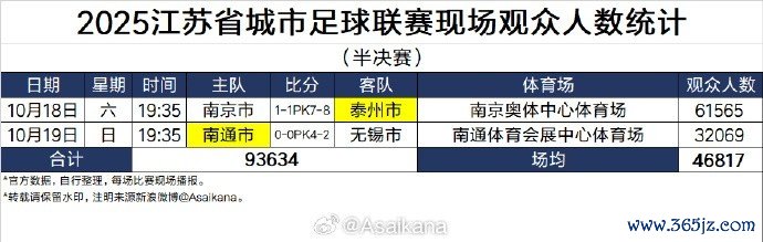 苏超半决赛现场观赛人数场均46817人 南京奥体中心61565人创新高