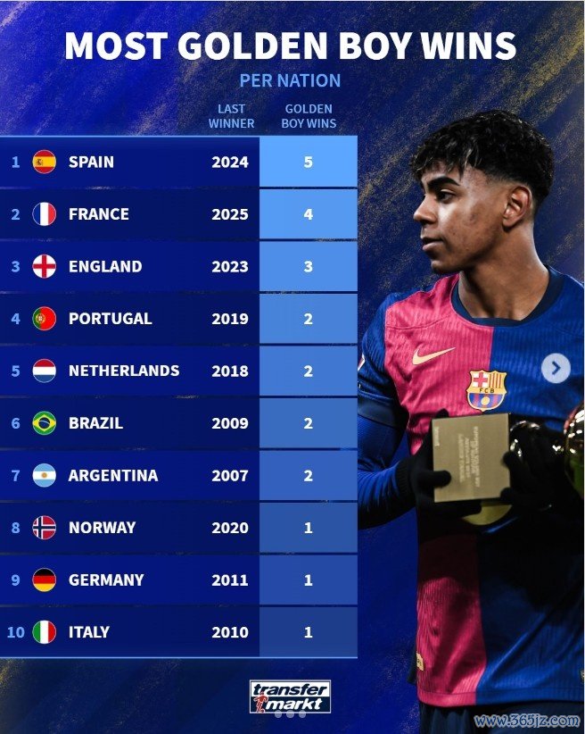 各国球员赢得金童奖次数排行:西班牙5次居首,法国4次位居第二