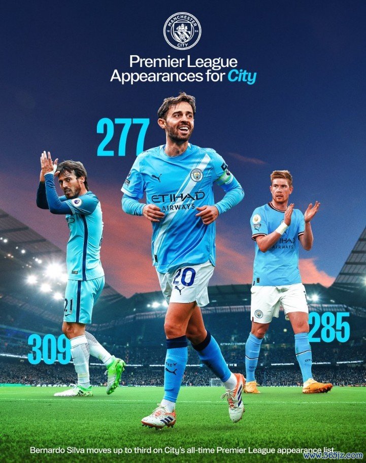 队史第三!B席第277次为曼城在英超出场,仅次于席尔瓦、德布劳内