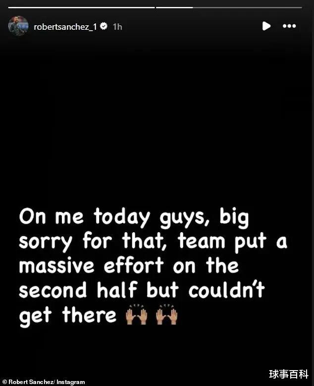 赛后,切尔西守门员罗伯特·桑切斯就自己的驱逐 错误 做出了道歉。他在Instagram快拍上发布声明,主动承担责任:“今天怪我,真的很抱歉,球队在下半场拼尽了全力,但还是没能反转 。”